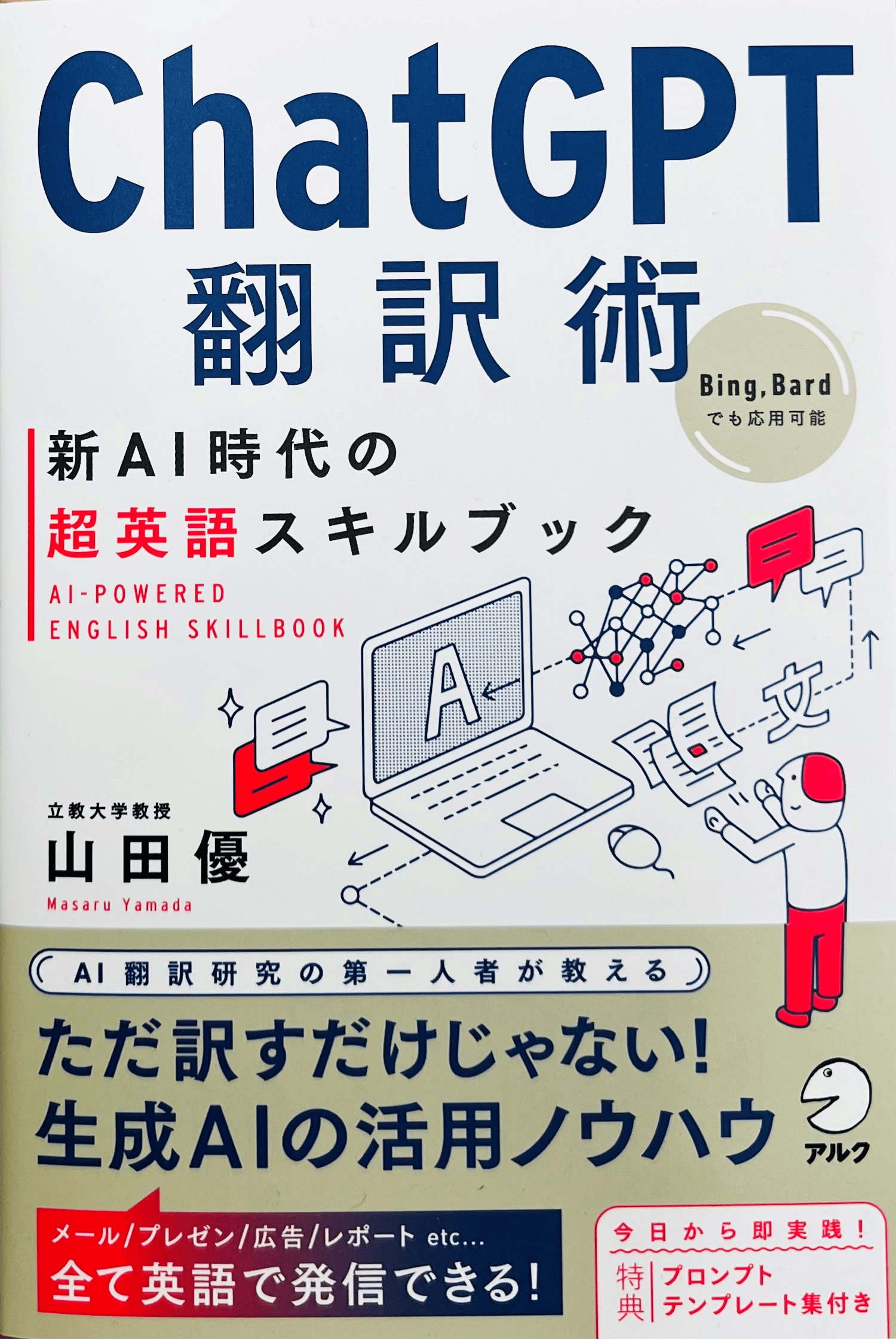「ChatGPT翻訳術 新AI時代の超英語スキルブック」がアルクから出版された。著者は立教大学教授の山田優先生。ChatGPTは、通常の翻訳機能を超越した、新次元の対話型翻訳ツールであり、指示するだけで柔軟、かつきめ細やかに対応してくれる、自分だけの、まさにその場、その場に会った翻訳が可能になった、と冒頭が始まる。AI翻訳の進化を踏まえ、ChatGPTを使った翻訳術が実戦形式でわかりやすく書かれている。
