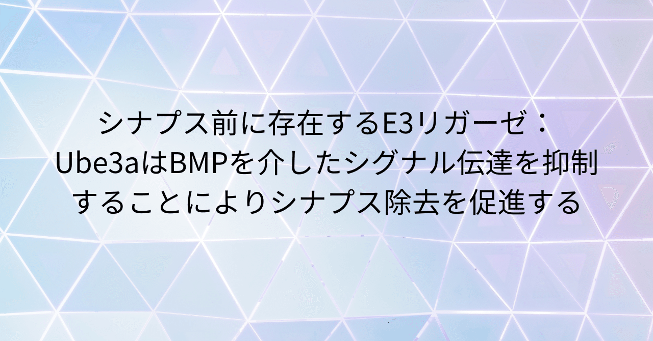 ユビキチンE3リガーゼであるUbe3aは、アンジェルマン症候群の原因因子として知られていますが、その生理機能は十分に理解されていませんでした。今回の研究では、Ube3aがキネシンモーター依存的にシナプス前部に輸送されて、シナプス前部のBMP受容体分解を介してシナプス除去を誘導することを発見しました。