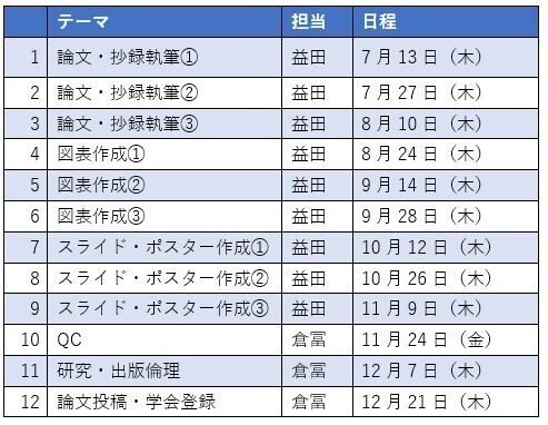 ・益田講師担当分の1~9回(論文・学会資料作成)のみ、倉冨講師担当分の10~12回(出版・研究倫理等)のみの受講も可能です。