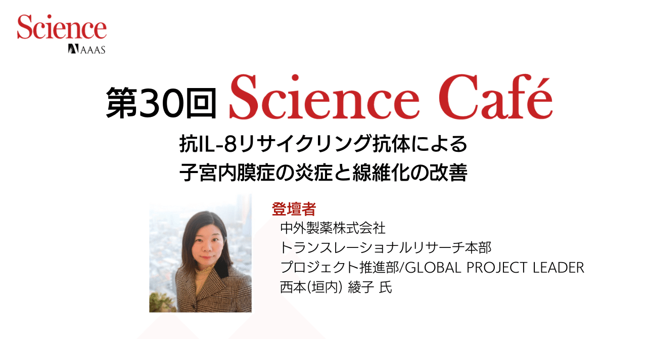 第30回Science Café「抗IL-8リサイクリング抗体による子宮内膜症の炎症と線維化の改善」、が5月30日に開催された。Caféでは企業研究者初、中外製薬株式会社トランスレーショナルリサーチ本部プロジェクト推進部/Global Project Leader西本(垣内) 綾子氏の発表である。